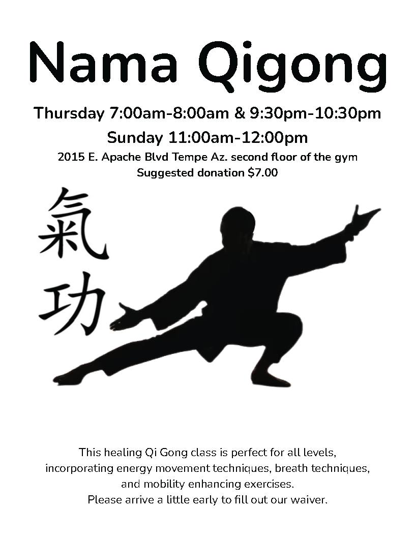 Qigong on Sundays 11:00am-12:00pm. This healing Qi Gong class is perfect for all levels, incorporating energy movement techniques, breath techniques, and mobility-enhancing exercises. Call or text (844) 494-4345 for entry. You can also DM us on IG @namayogashop Located on the 2nd floor of the gym at Culdesac Tempe Apartments. Suggested $7 donation. Water fountain